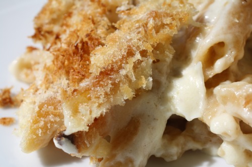 4. Pour the mixture into a buttered square baking dish. Top with panko and a few dots of butter. Place the baking dish on a rimmed baking sheet and cook 30 minutes, until bubbling. Then, place under the broiler until the panko is golden, another 3 to 5 minutes. Let rest 5 minutes before serving. Serve hot.