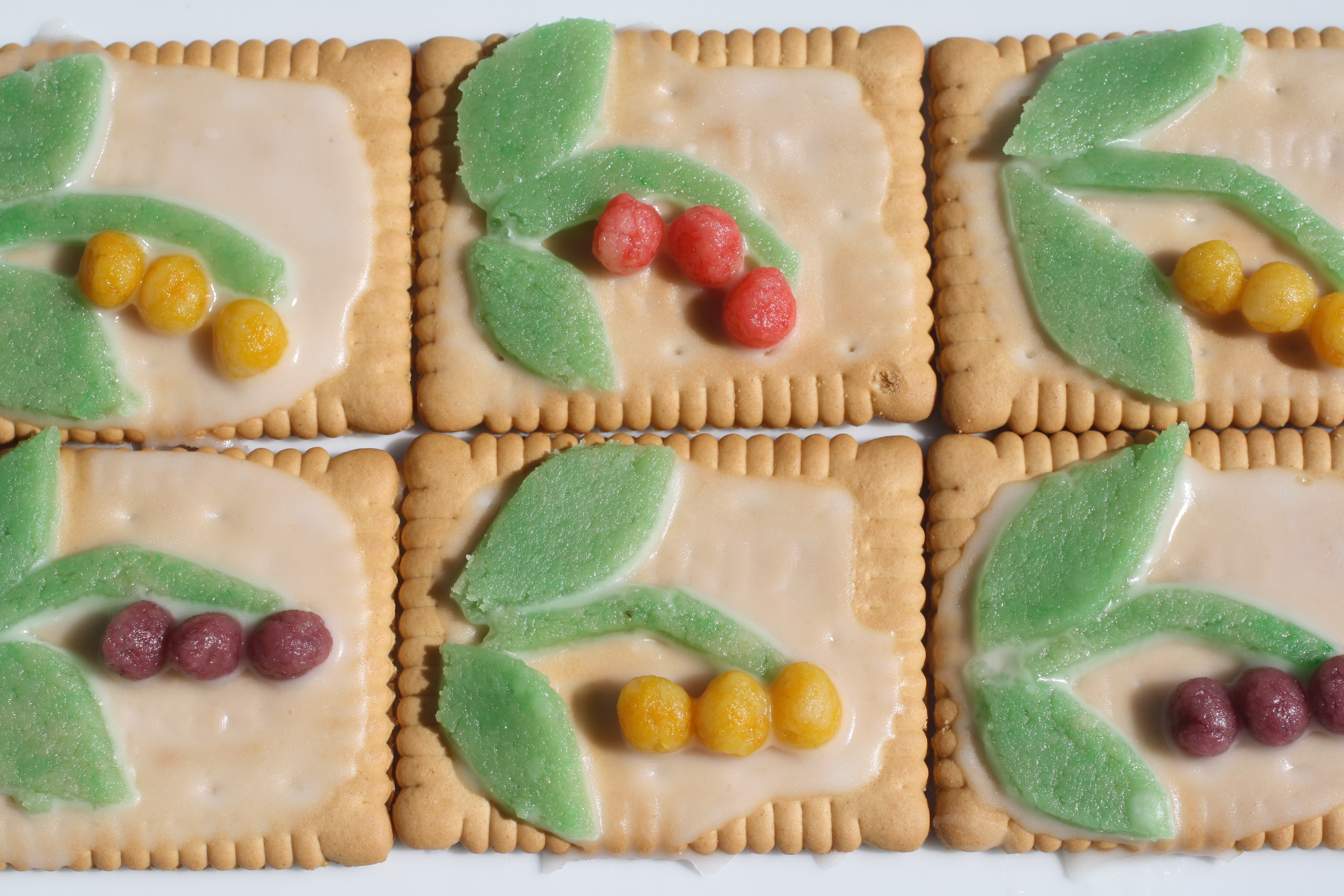 Use the back of a teaspoon to spread glaze onto Petits Beurres. Then, arrange a stem and 2 leaves on the wet glaze, and finally three blossoms. Allow to sit and dry on a rack for 1 hour.