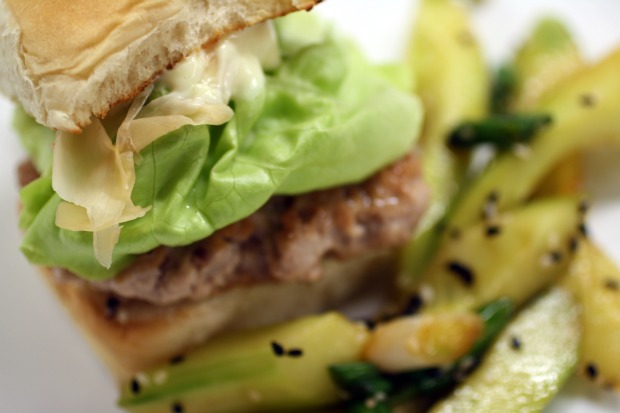 Spread some wasabi mayo on each bun. Top the burger with some lettuce (I forgot it in the video, but you should use it!) and pickled ginger. Serve with cucumber salad on the side (I toss chunks of cucumbers with soy sauce and sesame seeds). You’re done!