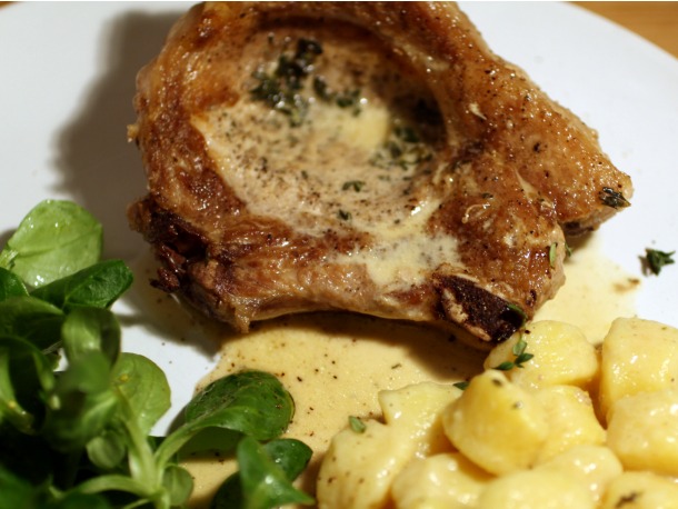 Take the pork out of the fridge 15 minutes before you want to use it. Cut off the fatty rind if there is one. Season the chops all over with salt, pepper, and thyme, pressing the seasoning gently into the meat so it sticks. Preheat a wide skillet or sauté pan with the olive oil over medium heat. Bring a pot of salted water to boil for the gnocchi. Add the pork to the hot skillet and cook 5 minutes on each side, until nicely golden brown. Add the gnocchi and cook 2 minutes until it floats to the top of the water, and drain. With the pork still in the pan, add the cider and then the cream. Cook another 5 minutes until the pork is cooked through and the sauce is reduced. Toss the gnocchi in the sauce with the pork chops and serve right away with a light green salad.print this recipe