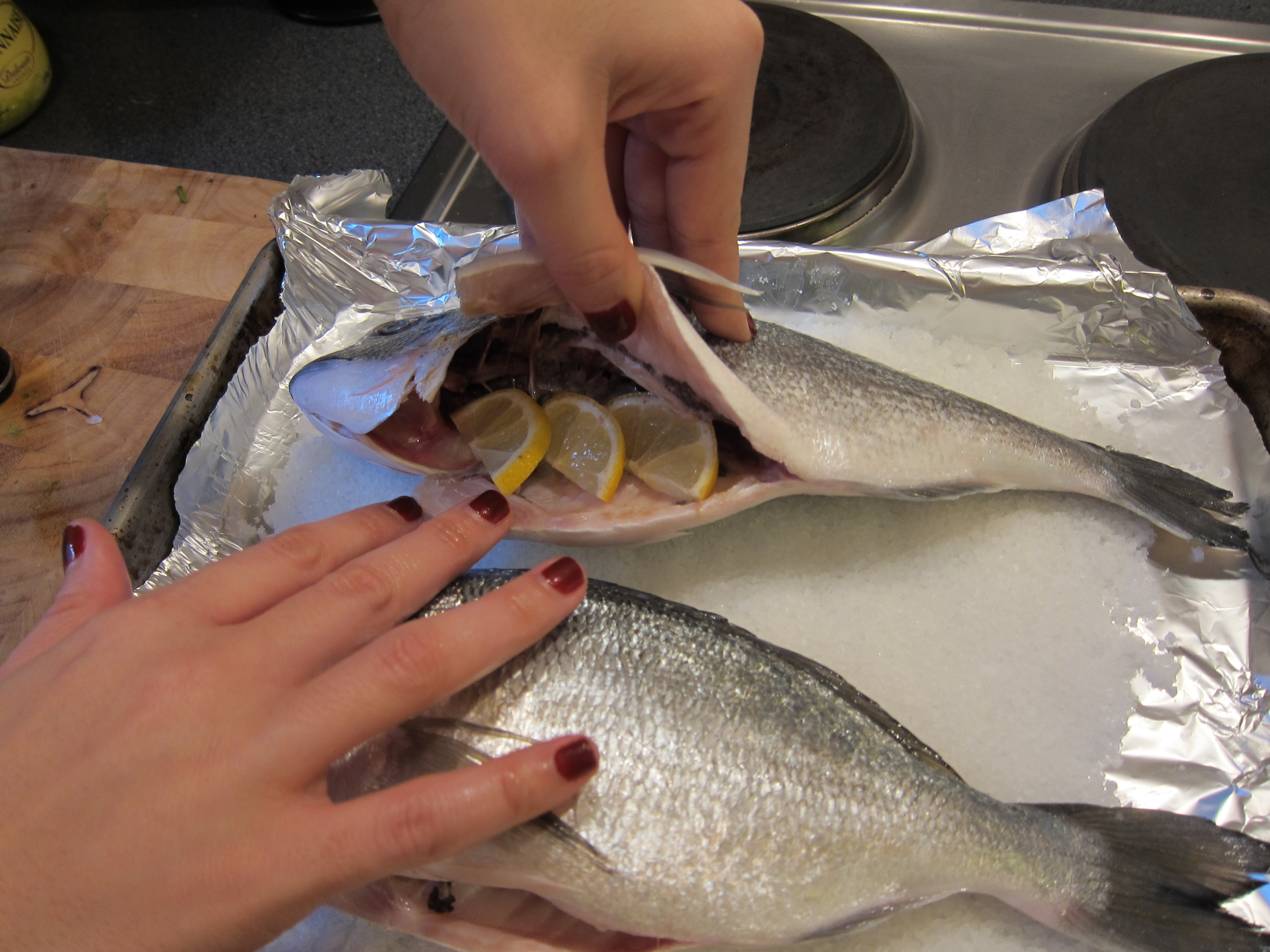Fill the cavity of the fish with lemon and herbs. Yum!