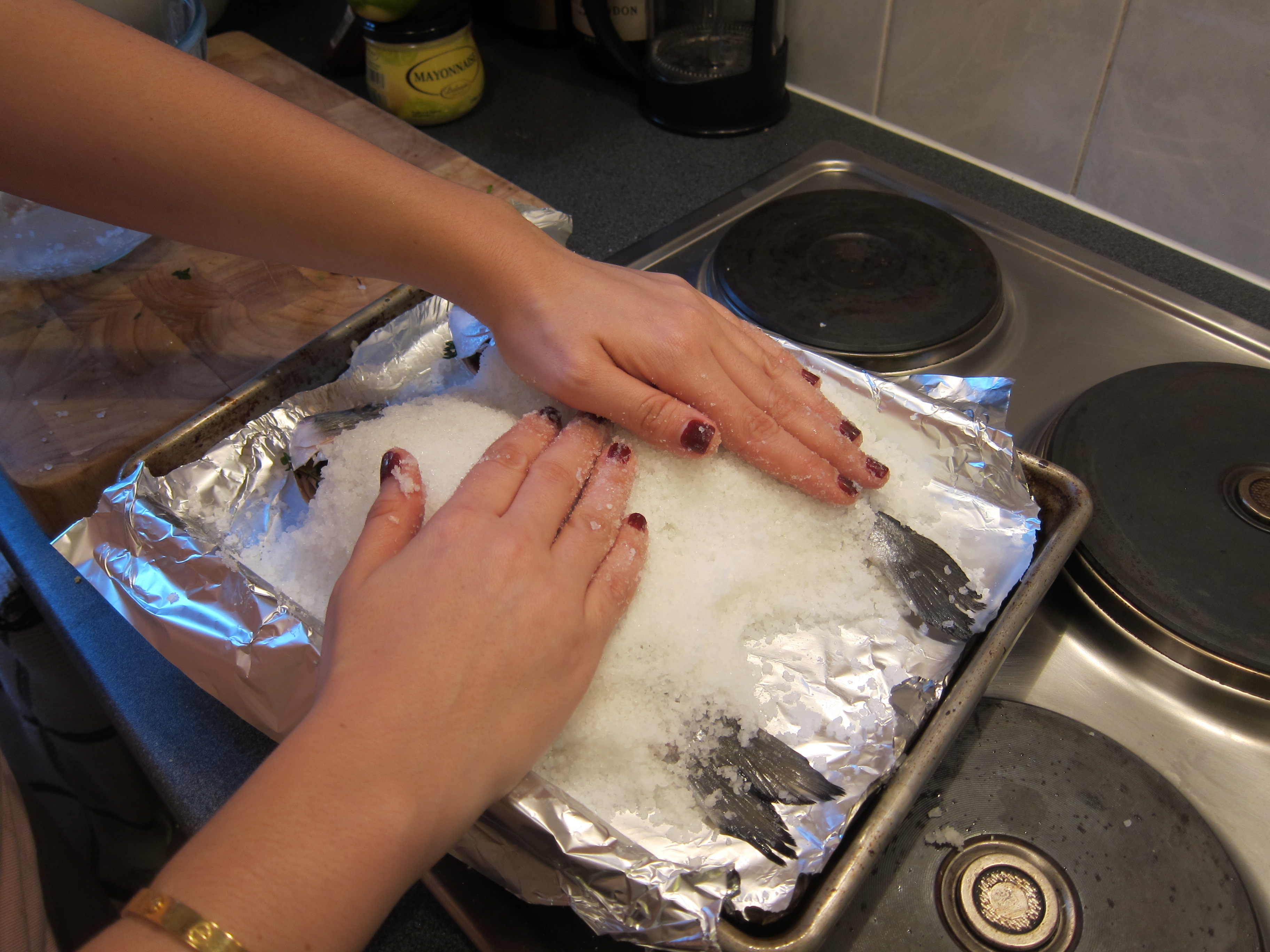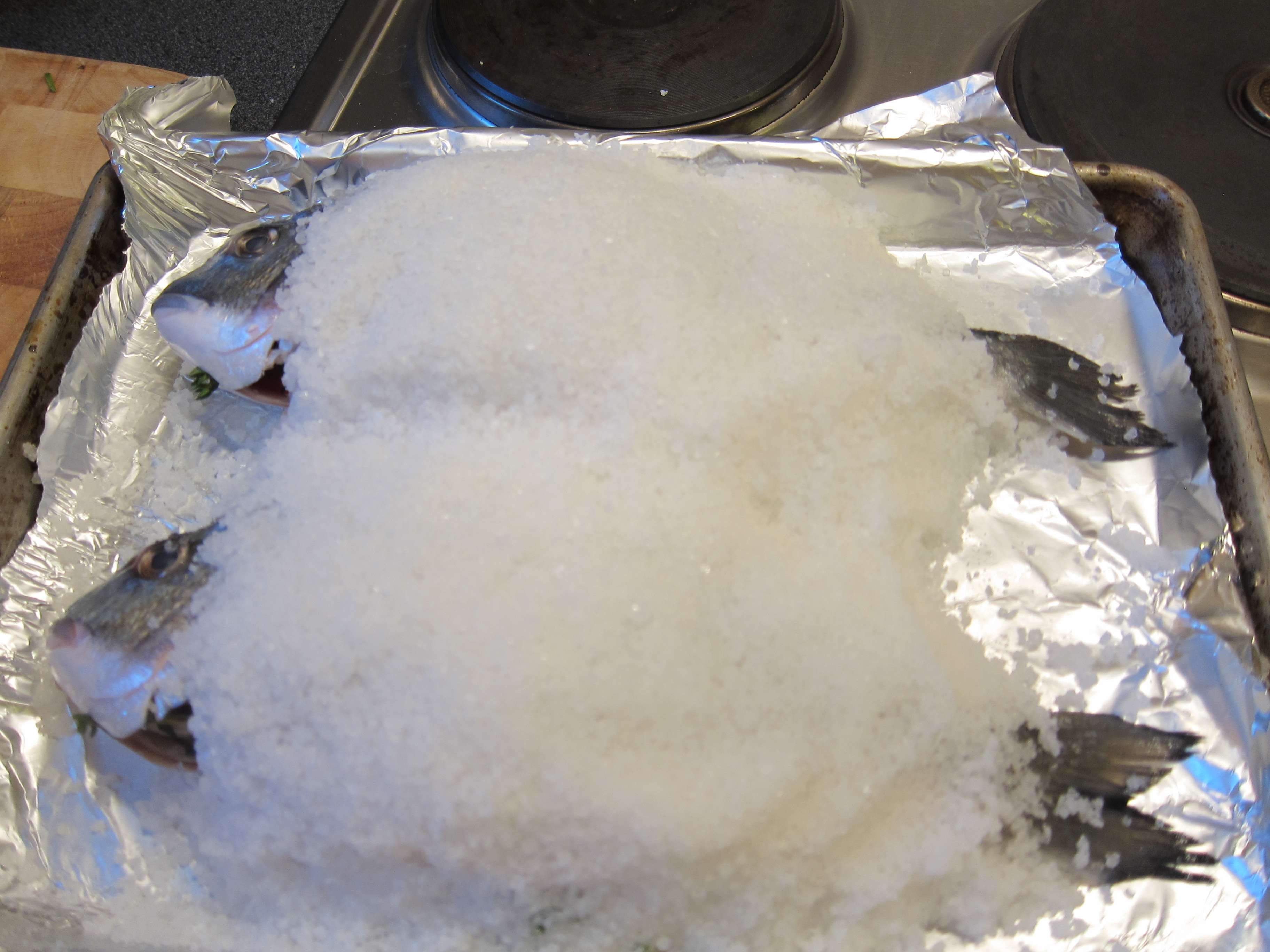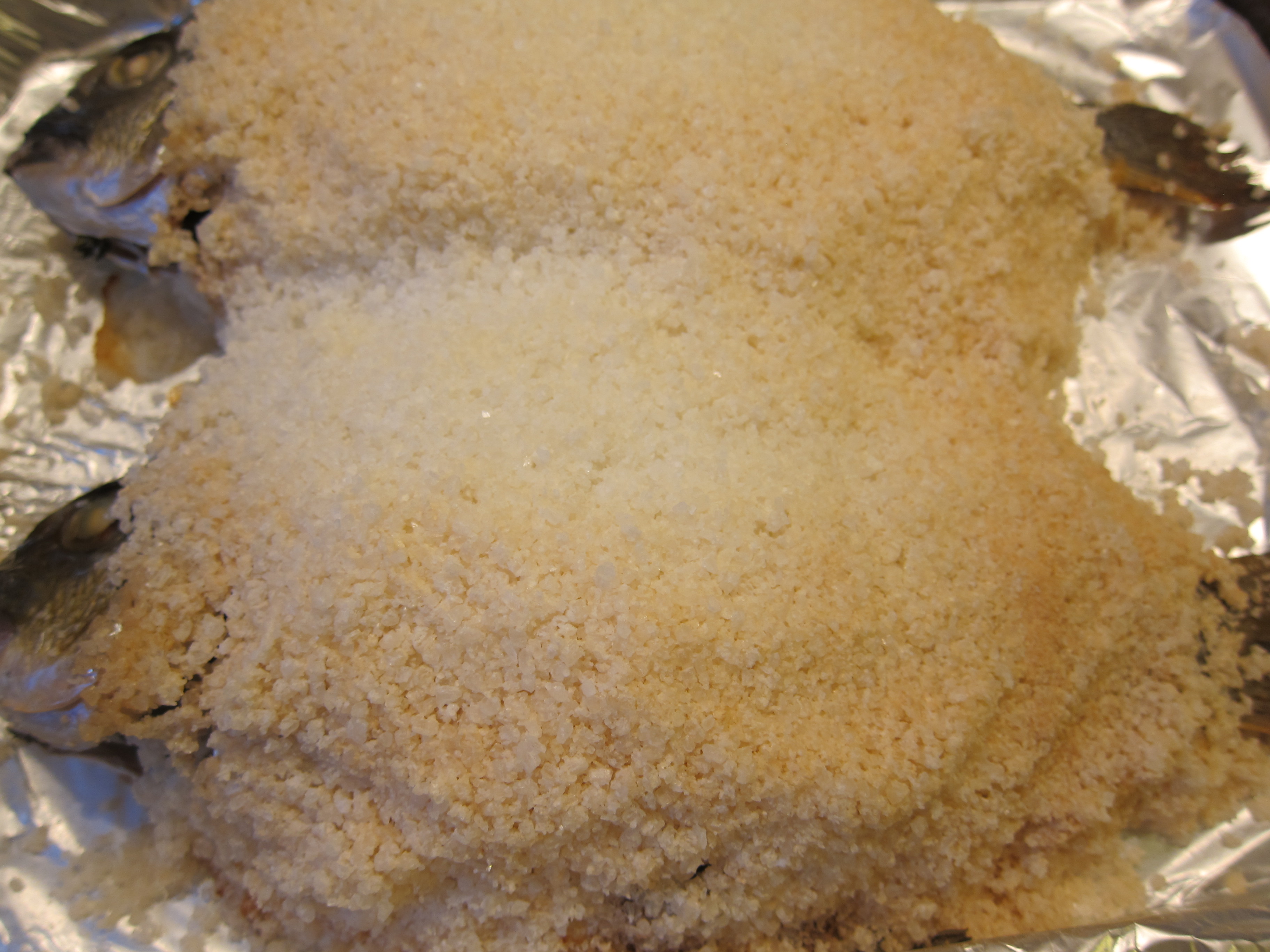 Pack the salt mixture up and around and between the fish–everywhere but inside!