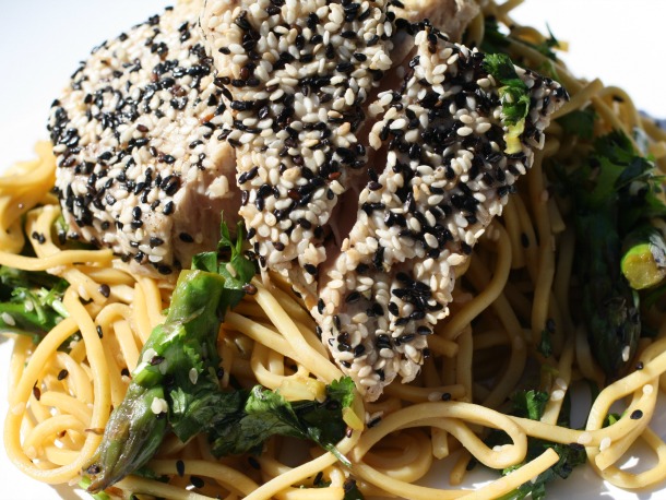I start with lean pork loin, and roll it in a crust of sea salt and Chinese five spice powder. I really am a huge proponent of buying regional spice blends. It’s a great way to add a kick of China (or India, or Morocco, depending on the recipe), without having to invest in all the separate components. I find I use up these blends far more quickly then I ever do individual spices. Five spice consists of star anise, cloves, cinnamon, Sichuan pepper, and fennel seeds, so it has a spicy, musky fragrance, and that really powerful sweetly spiced pungency that creates the most fascinating crust on the pork. I sear that in a pan, and throw in some exotic mushrooms, and they all roast together in the oven without any interference from me until the pork is juicy and the mushrooms are crisp and charred. They’re done in just 20 minutes.