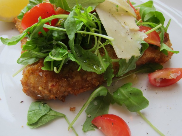 Start off with two pieces of veal scaloppini. You can either ask the butcher in the supermarket to pound it out for you, or, you can picture the face of your arch nemesis (not that you have one) on the meat and do it yourself with a meat mallet or a heavy pot. Then, do a flash dip of the meat into a beaten egg, and then into a mixture of breadcrumbs and grated Parmesan cheese. Quickly fry in a sautépan (no need to deep fry and this only takes three minutes), and top with a salad of arugula, tomatoes, and more shaved Parm. A squirt of lemon, and dinner is served. It’s so good—sort of like Little Italy, light.
