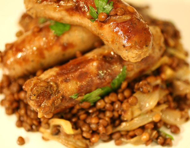 One night last summer when I was in Nice with my family and Mr. English, I skittered between two restaurants half a block apart, reading their menus. “This one, this one!” I begged. I had spied something, a local specialty, that I just had to try: sausages and lentils. So humble, and yet I knew it would be elegant in its simplicity. Really good, firm French lentils that never lose their figure. Sausages full of smoky bacon, wine, and garlic that snapped under the point of a knife. Both the sausages and the lentils were listed next to their provenance. These were special sausages, special lentils, with a pedigree and a history. Who could resist?