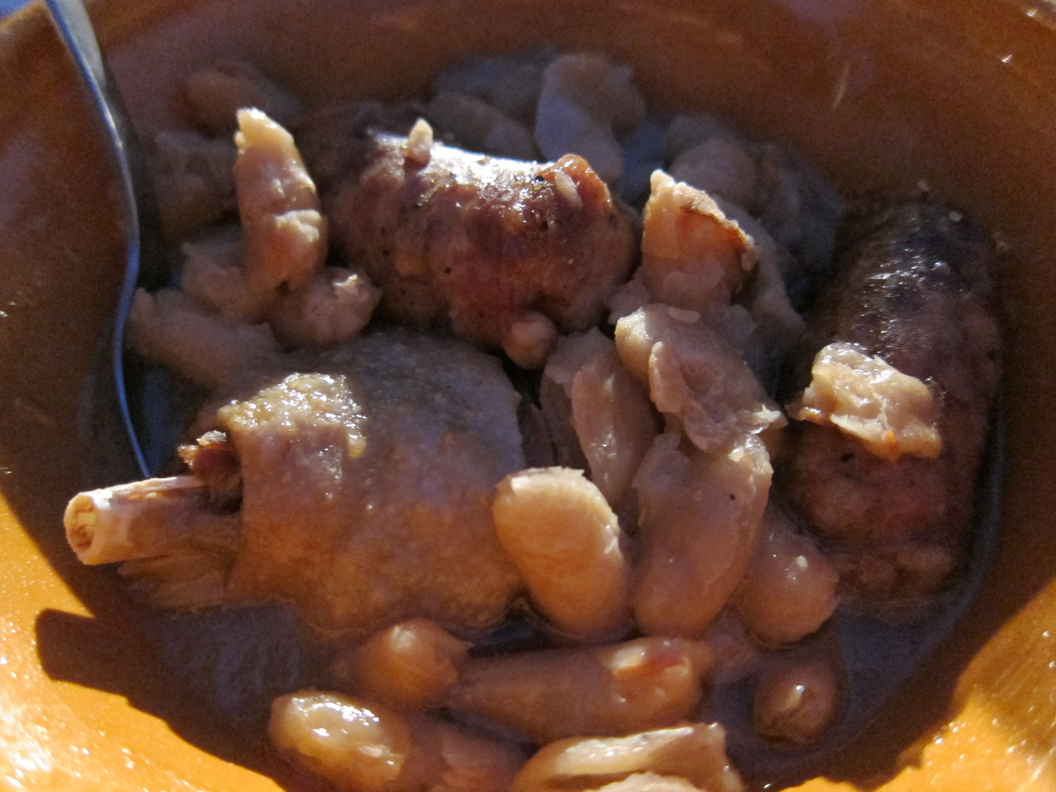 If I could swear myself to one French dish for the rest of my life, exclusively, it would be cassoulet. In fact, I had never before in my life tasted cassoulet. I was a cassoulet virgin. I thought cassoulet came from Toulouse, but my stepfather gasped and said, “No! It is from Castelnaudary!” The French are proud of the provenance of these things. What is it? Big white beans baked in broth with pork fat, pork confit, sometime duck or goose confit, and garlicky Toulouse sausages. The meat falls of the both, and pulls apart. The beans are soft and filling and so good and comforting. The fat is, well, fattening, but it so much flavor and crispiness to everything. It is so good, so hearty, so almost medieval that I could not get enough of it. I was in Saverdun maybe 10 days–and I ate cassoulet five times. It’s a miracle I ate anything else!