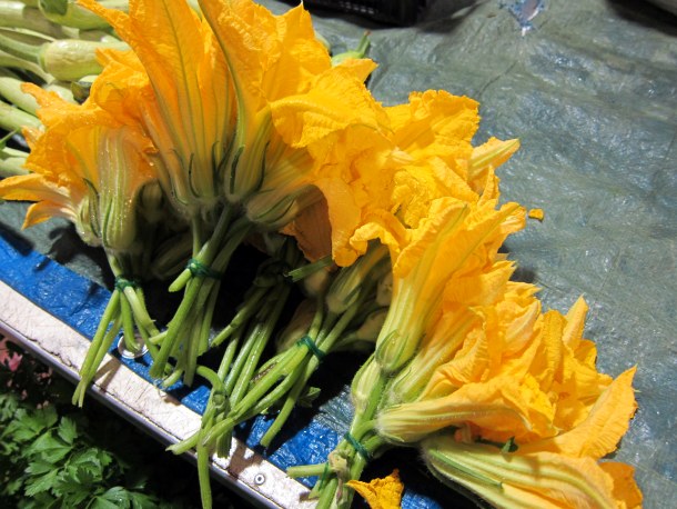 The market did not disappoint. Everywhere were those darling little sweet white peaches that are flattened out as if God had accidentally sat on the first one, and they had never recovered. I love those peaches. Huge, thin zucchini that twirled this way and that like overgrown fingernails. Heirloom tomatoes in large teardrop shapes, ridged as if swelling with pride. There were cheese stalls, where my parents haggled to taste every tomme in the place in search of some mythical cheese that had bought and couldn’t find again. We tasted shards of sheep’s cheeses, and cow’s cheeses, and goat’s cheeses. That wasn’t such a bad activity. Butchers with whole rabbits and chickens. A fishmonger with langoustines and enough mussels to make my previous attempts at all-you-can-eat mussels seem pretty feeble. I bought an orata, which I’ve been noticing on a lot of New York menus. Scaled, gutted, and gilled before my very eyes. And then, my most precious find: zucchini flowers. I love them, probably most, frankly, for their rarity. They are only in season in the States for a second, blooming off the ends of the summer squashes and zucchinis. I sometimes find them at the Union Square Farmers Market, or at Whole Foods, but they are exorbitant–sometimes a dollar per flower. In Nice, I mentioned yesterday, they fry them up in beignet batter, and serve them with lemon wedges as street food. There’s something about getting a diamond for the price of a lump of coal.