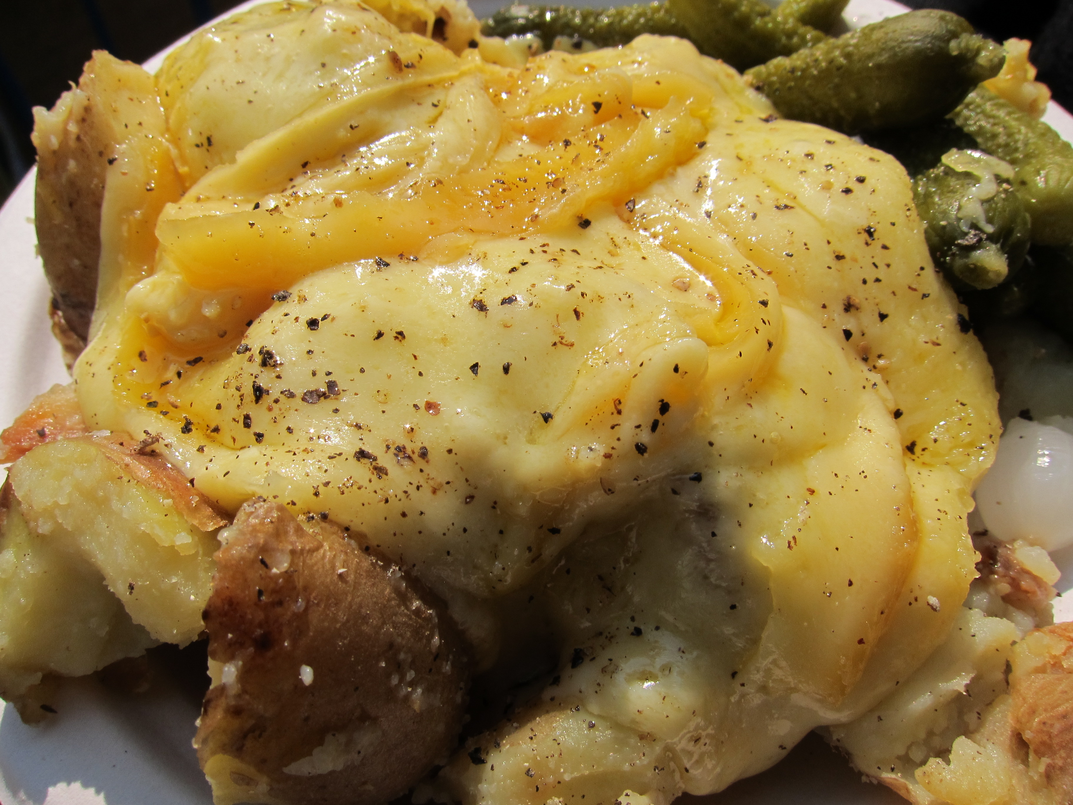 But just to have a little fun, this is a mashed potato mash up of that strictly bordered potato menu: Aligot, with a hint of American flavor. Instead of crème fraîche, I use sour cream. Easier to find, and cheaper anyway. Instead of tomme or cantal, a sharp white cheddar. The elasticity suffers a bit, but the flavor is excellent. And instead of garlic, snipped fresh springy chives. All the flavors of a baked potato, loaded into an Aligot mash. If you wanted to gild the lily, I’m not opposed to some homemade bacon bits. Just a tad gluttonous.