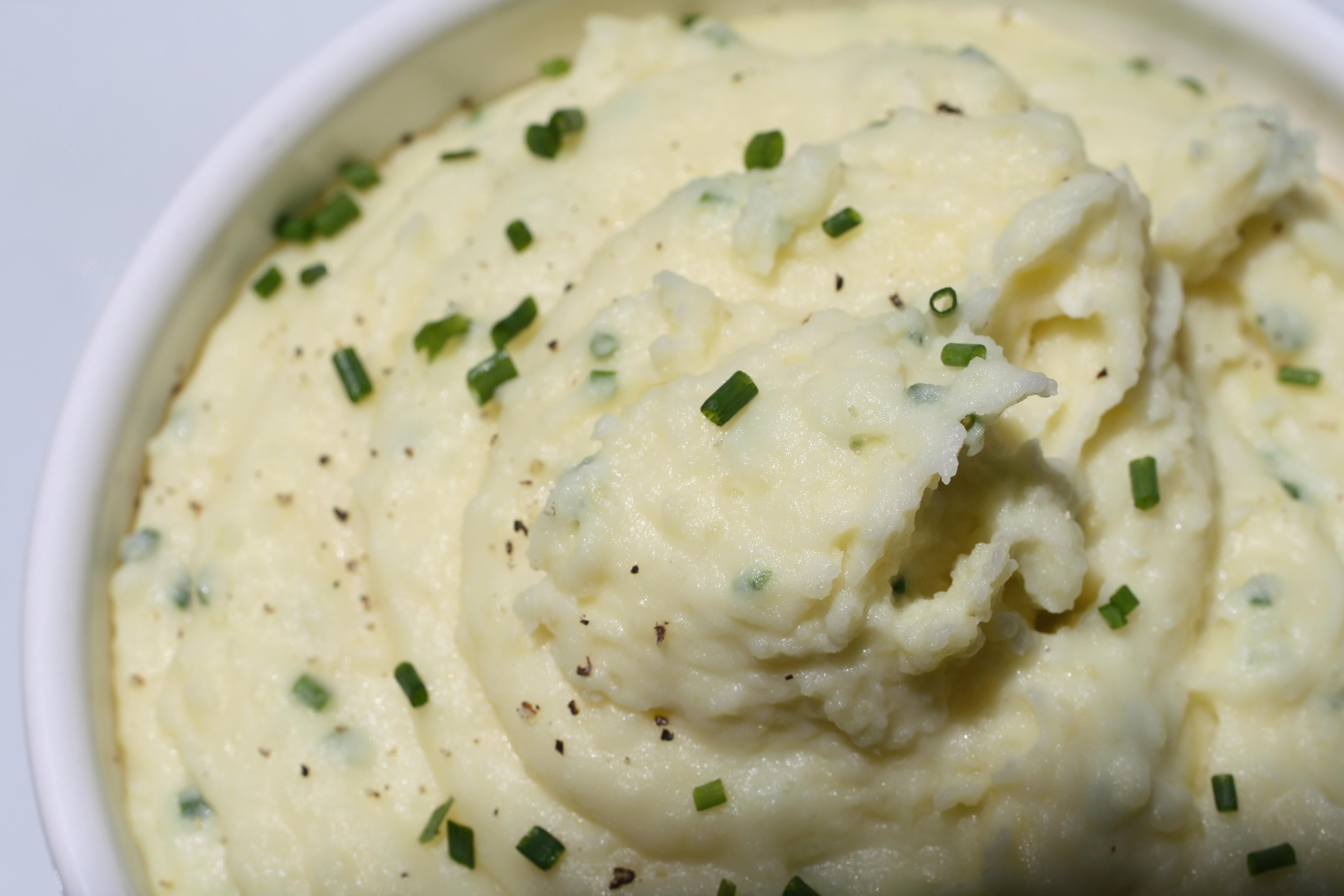 Add the sour cream and half and half to the pot. Pass the potatoes through a ricer into the sour cream mixture. Beat together with a wooden spoon. Then, beat in the cheese in handfuls, and finally the chives. Season with salt and pepper.
