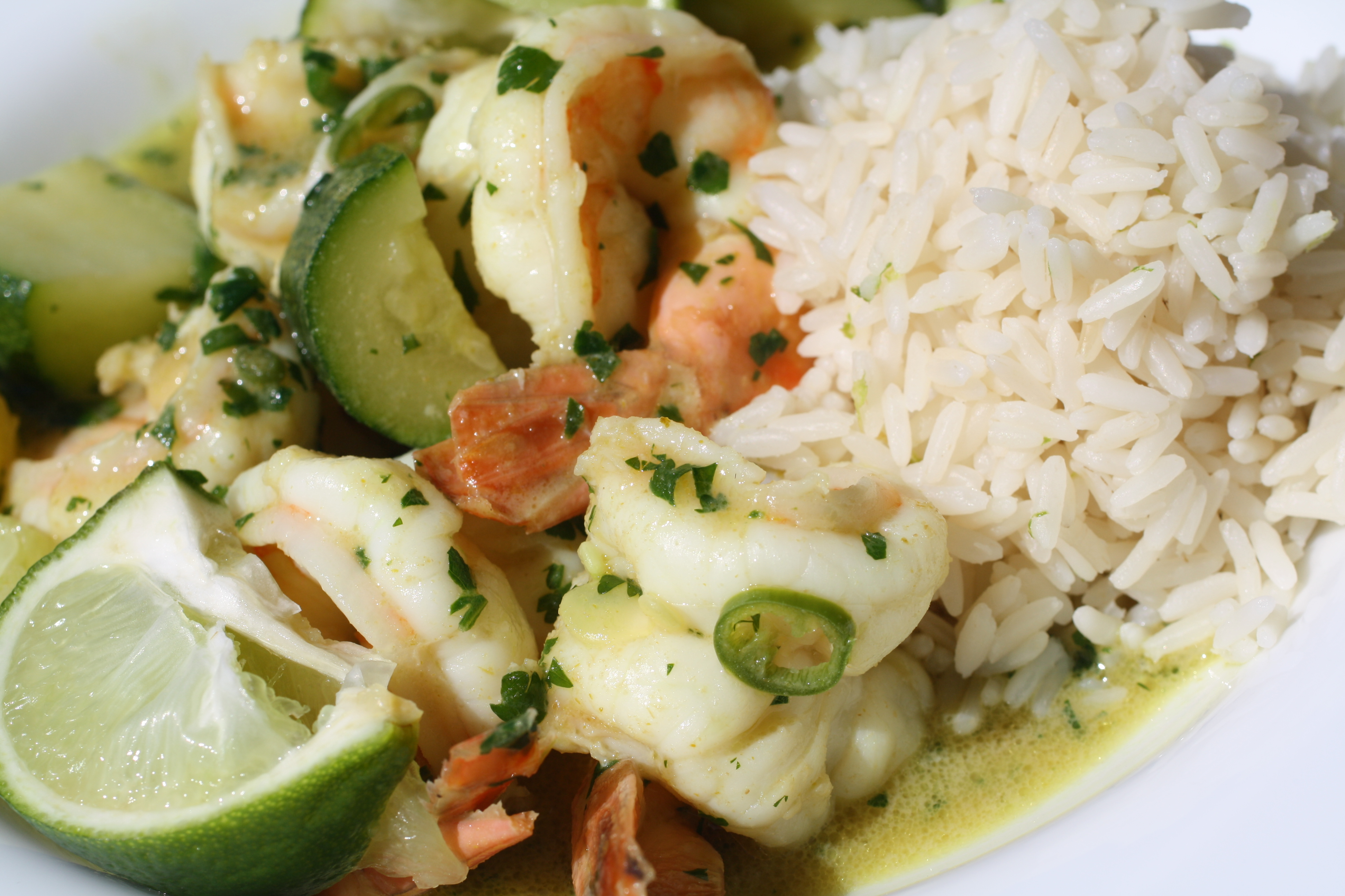 It’s so simple. I poach zucchini and shrimp in a broth made from coconut milk and Thai green curry paste. You can get coconut milk and curry paste at regular grocery stores these days, and if you have leftover curry paste, lucky you. It keeps for a good while in the fridge, and you will be making all kinds of varieties of this curry once you see how easy it is. Broccoli and chicken, squash and salmon. You name it.