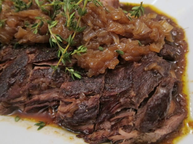 So I made my own version of slow-cooked bavette aux échalotes.  I slowly caramelized the shallots until they were soft and sweet and deeply gold.  Then, in the same pot, I just seared the two flank steaks to give them a nice barbecue-like bark, then poured some red wine and stock, garlic and thyme, and some of the caramelized shallots over them.  I left them to blip away while I got on with the rest of my life for four hours.  By the time the Bewleys arrived, the meat was fall-apart tender, and the red wine sauce sweet and reduced.  I didn’t have to sear steaks ‘à la minute’.  I just sliced up the steak–although it’s more like stew at this point, which I love–topped it with the reserved caramelized onions, poured over the red wine jus, and topped with some fresh thyme for appearances.  It was all gone by Matilda’s bedtime.