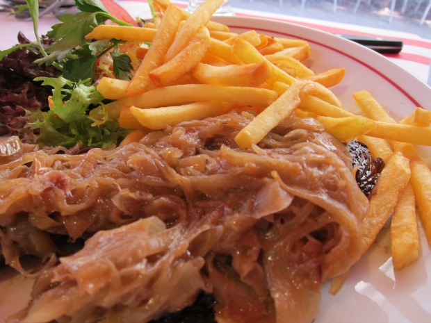 Bavette aux Echalotes Bavette aux échalotes is a commonplace bistro dish, and I remember exactly when Mr. English fell in love with it.  It was at a tiny, vivacious place called the Coquelicot in Antibes.  He was sorting through the menu and asking me to translate.  When I finally said steak with onions after translating a few in the vein of ‘veal kidneys’, he put down the menu and declared ‘done!’  Ever since then, it has been his ‘safe’ French dinner out if all else looks too Gallic.